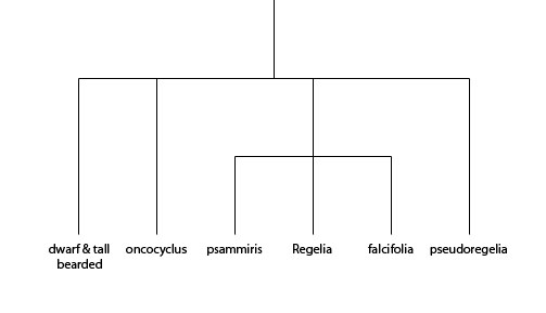 In reading such a diagram, an analogy with a human family tree may be helpful. The two aril groups, oncocyclus and Regelia, are like siblings, more closely related to each other than to any of the other groups. The bearded irises (both the dwarf bearded species and the tall bearded ones) are their "first cousins". The psammirises are one step further removed, "second cousins", as it were, to both the arils and the bearded irises. The next step further out we find "third cousins" I. dichotoma and I. domestica, which you may recognize as the parents of the popular garden plant I. X norrisii. Other groups in the genus are even more distant relations.