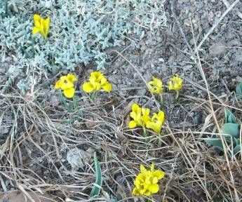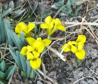 Warm weather the first two weeks in March ushered in pumila season, with a Hildebrandt seedling from SIGNA seed 04A004 opening on March 18, the same date as last year. This one is building a consistent reputation as the first bearded iris to bloom here. On March 23, three more pumilas opened: 'Hobbit' (Miller, '04) an Armenian seedling P002-04, and a taurica P003-01. P002-05 followed on March 25. 'Sudden Butterflies' (Jensen) bloomed the following day. The last weekend of March brought bloom on 'Steppe' (J. Burton, 2011) and two forms of I. attica. 'Hidden Dragon' opened on March 30, followed by 'Keystone Oracle', more pumila and attica seedlings, and I. babadagica.