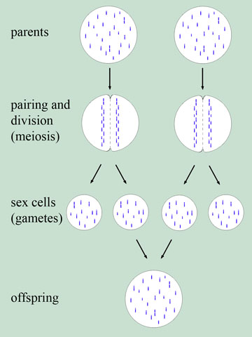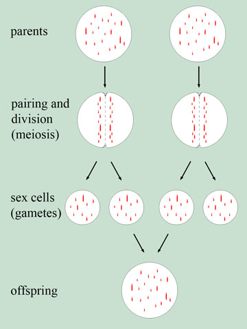 (This set will not be the same as the set the organism received from either of its parents, as the chromosomes move into the sex cells at random, without regard to which parent they came from. It is this fact that allows new combinations of genes in each generation, and ensures that no two offspring will be identical.)
