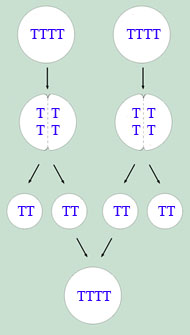 Suppose I take two tetraploid tall bearded irises, say 'Beverly Sills' and 'Gypsy Lord'. Both are TTTT. Each can happily pair to produce sex cells, each of which contains two sets of 12 chromosomes each, TT. Both are thus fertile. The resulting seedlings are again TTTT, fertile tetraploids. In this way, we see that the modern tall beardeds (all of which are TTTT) are a fertile family; they can cross with each other indefinitely, producing fertile offspring.