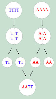 Is an AATT iris likely to be fertile? The answer, quite happily, is yes! When it comes time for this arilbred iris to reproduce, each chromosome can find a homolog. Every chromosome in one A set can pair with a chromosome in the other A set, and likewise the two T sets can pair. A does not pair with T, but they don't need to! It's as though the plant has two large sets of chromosomes, each A+T. These two "supersets" can pair and separate, producing sex cells that are each AT. Such a plant is called an amphidiploid (a "double diploid").