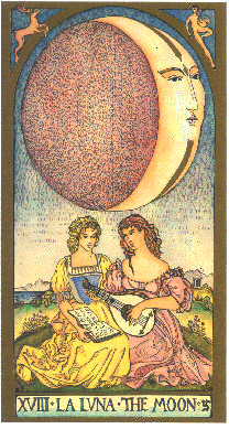 The Moon card depicts two women playing music; the Sun