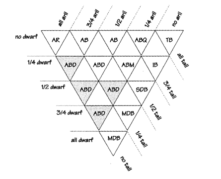 Although a horticultural classification system does not assign plants to classes on the basis of ancestry, a plant's garden qualities are certainly expressions of its genes. Most plants from similar breeding will fall naturally into the same class. The triangle diagram illustrates the relationship between ancestry and horticultural class. Ancestry can be aril, tall bearded, or dwarf bearded. The amount of each type of ancestry can be none, 1/4, 1/2, 3/4, or all. If the plants are tetraploid, these steps correspond to complete chromosome sets. Classes that currently contain few or no plants are shaded.
