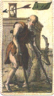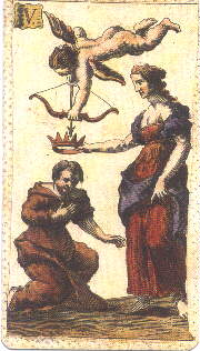 This particular deck is the most beautifully drawn of the various Minchiate decks depicted in Kaplan's Encyclopedia of Tarot. The style reminds me of antique maps and star charts, immediately bringing to mind classical mythology and the allegorical art of the Italian renaissance. I relate to this deck very well, esthetically and culturally. Some of the trumps have symbolism that varies greatly from the Tarot of Marseilles and its descendants, but which will be familiar to students of the Italian tarot tradition. The Tower, for example, depicts a woman fleeing from a burning building; the Moon shows an astronomer; the Chariot driver is a woman, and the World dancer is a boy. The Lovers card shows the man kneeling to be crowned by the woman. Apparently unbeknownst to him, the crown serves as sights for Cupid's arrow. Some things never change.