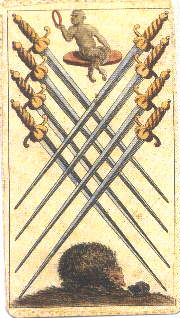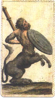 The idiosyncrasies of the Minchiate do not end with the trumps. The knights are centaurs (swords and batons) or weird half-human monsters (cups and coins). The pip cards have more interest than in most classic decks--many feature vignettes of animals and mythic creatures in odd poses. Their interpretation is far from obvious, but they do arouse one's curiosity.